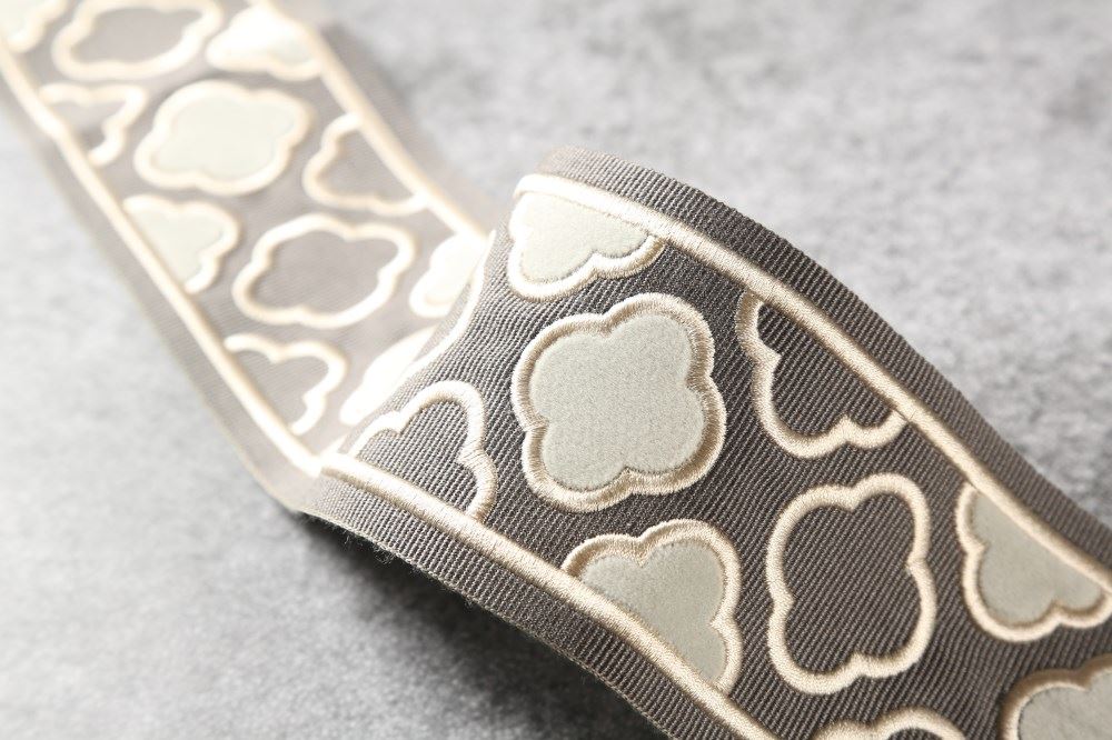 這款帶子,以貼布繡工藝,讓梅花呈現(xiàn)錯落的立體感;